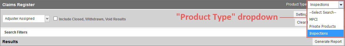 The options available in all other areas of the Claims & Inspections Register (e.g., the fields available in the Search Filters area, the columns available in the Results grid, etc.) change based on the selection made in this dropdown.